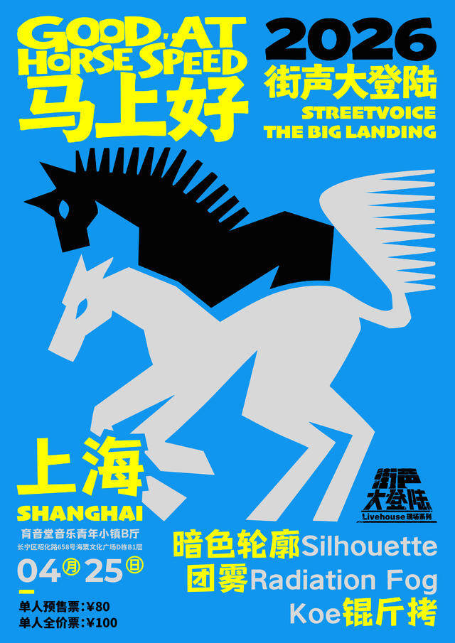 演出名称:【上海】暗色轮廓、团雾、Koe锟斤拷|街声大登陆 上海站 DAY 1【网上订票】演出时间:2026.04.25 周六 20:00