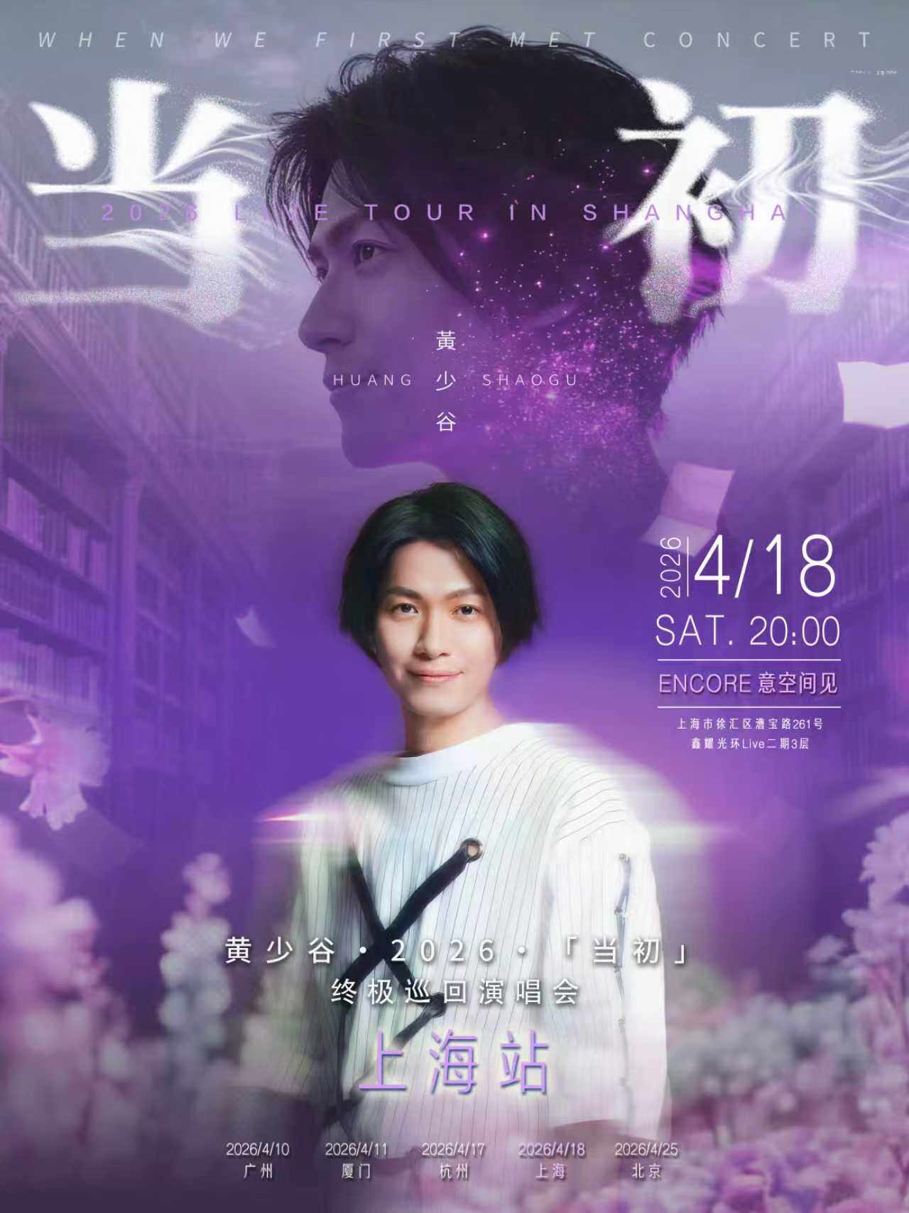 演出名称:【上海】04/18 上海站|黄少谷2026「当初」终极巡回演唱会【网上订票】演出时间:2026.04.18 周六 20:00