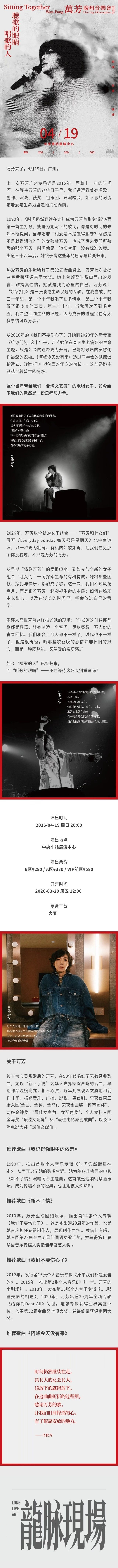 演出名称:【广州】“听歌的眼睛,唱歌的人”万芳广州音乐会【网上订票】演出时间:2026.04.19 周日 20:00