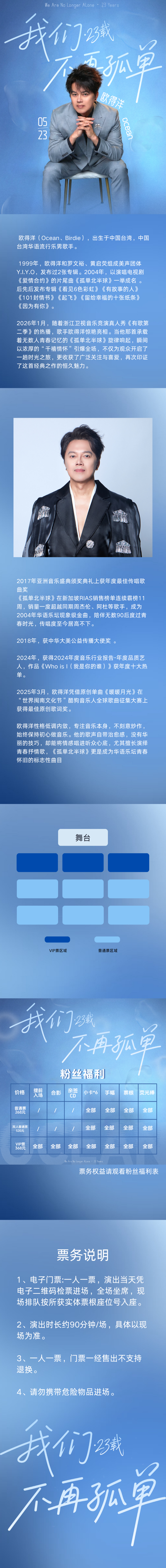 演出名称:【广州】欧得洋「我们不再孤单·23载」歌友会【网上订票】演出时间:2026.05.23 周六 19:30