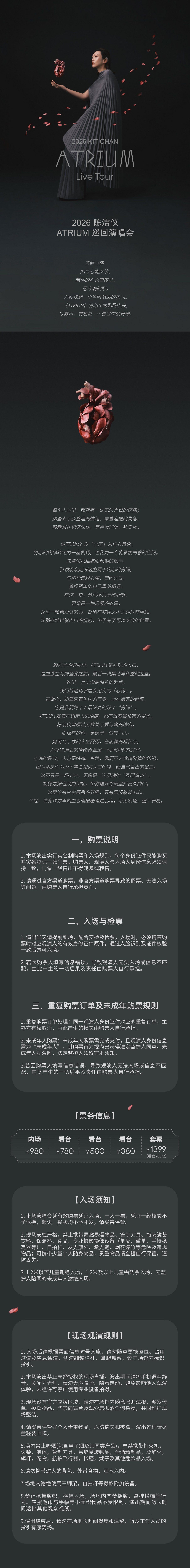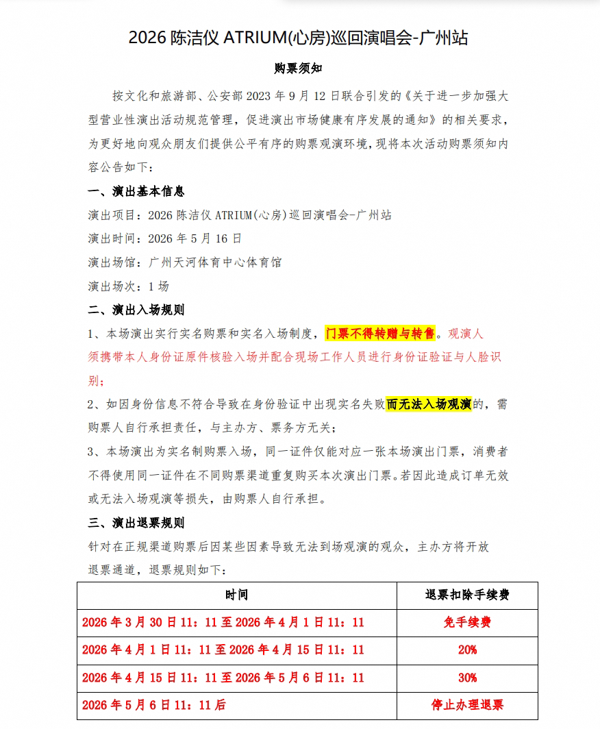 演出名称:【广州】2026陈洁仪ATRIUM(心房)巡回演唱会-广州站【网上订票】演出时间:2026.05.16 周六 19:00