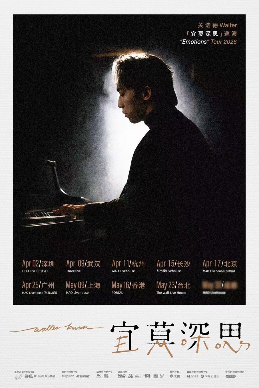 演出名称:【广州】关浩德Walter 2026「宜莫深思Emotions」巡演 广州站【网上订票】演出时间:2026.04.25 周六 20:00