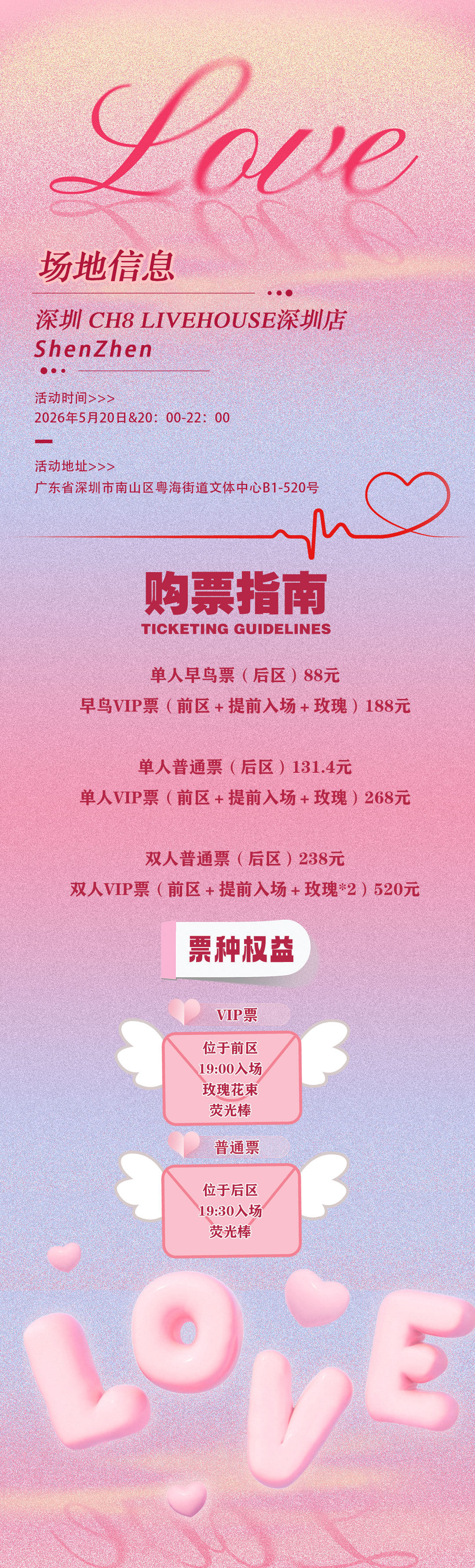 演出名称:【深圳】520情人节演唱会「以爱之名」·深圳站【网上订票】演出时间:2026.05.20 周三 20:00