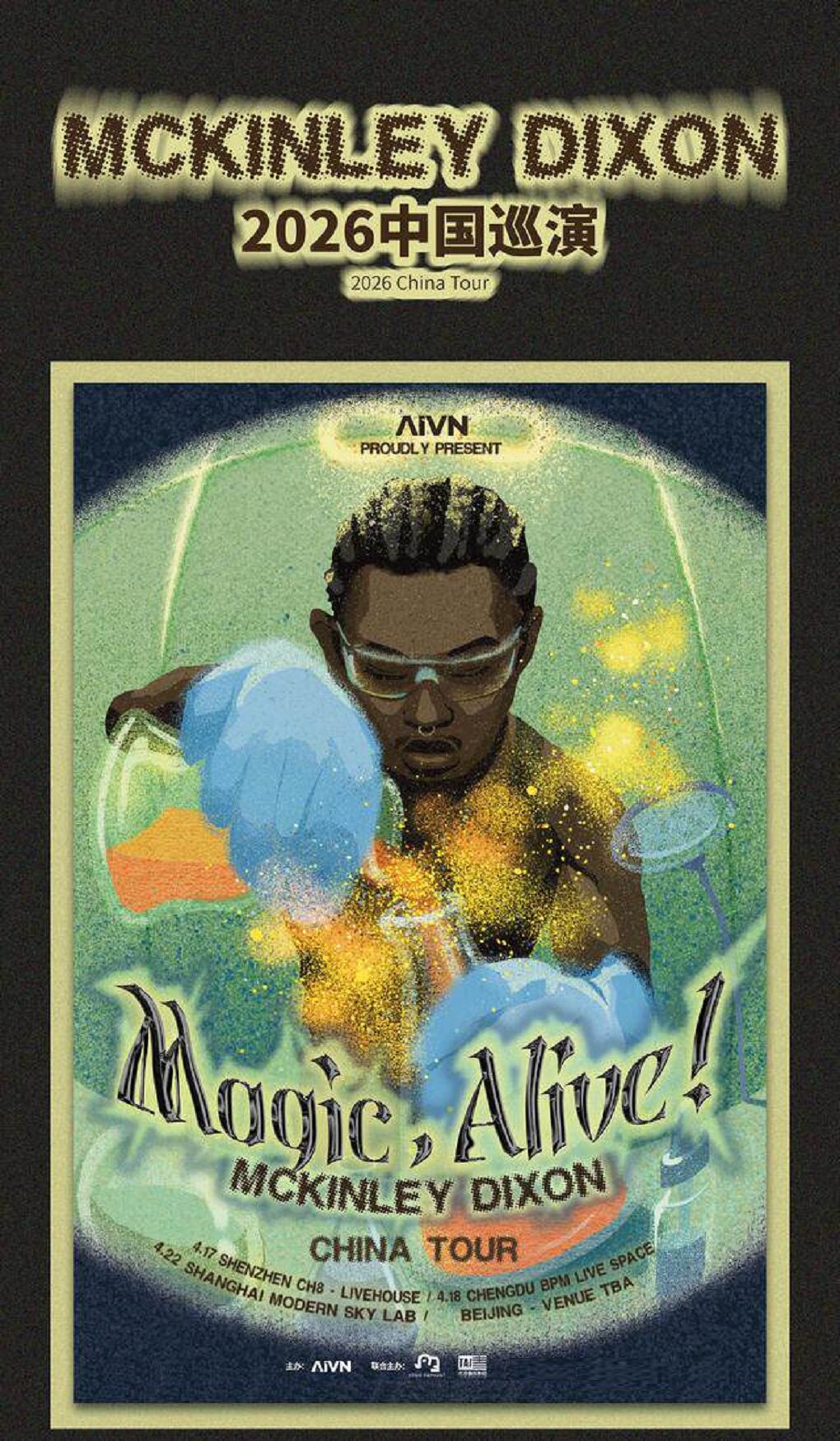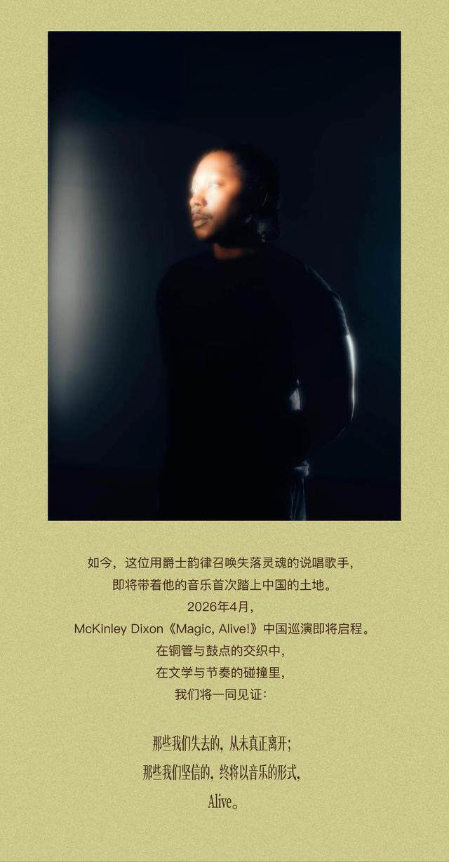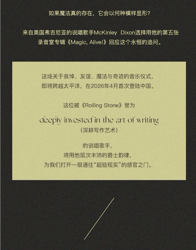 演出名称:【深圳】McKinley Dixon-Magic,Alive! 深圳站【网上订票】演出时间:2026.04.17 周五 20:00