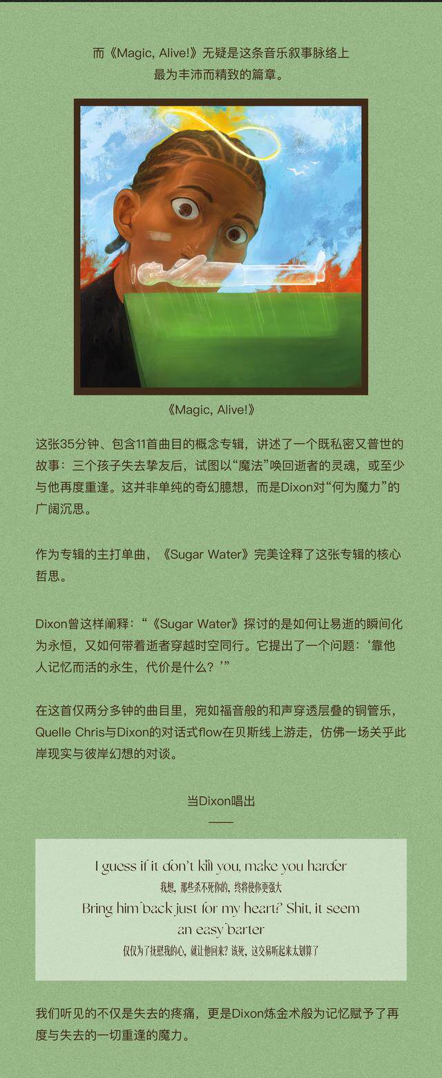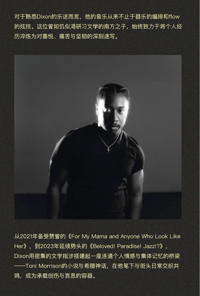 这张35分钟、包含11首曲目的概念专辑,讲述了一个既私密又普世的故事:三个孩子失去挚友后,试图以“魔法”唤回逝者的灵魂。Dixon用他层次丰沛的爵士韵律,将哀悼、友谊与奇迹编织成一场音乐仪式。从Toni Morrison的文学指涉到街头日常的鲜活记录,他的音乐从来不止于flow的炫技——更是对喜悦、痛苦与坚韧的深刻速写。