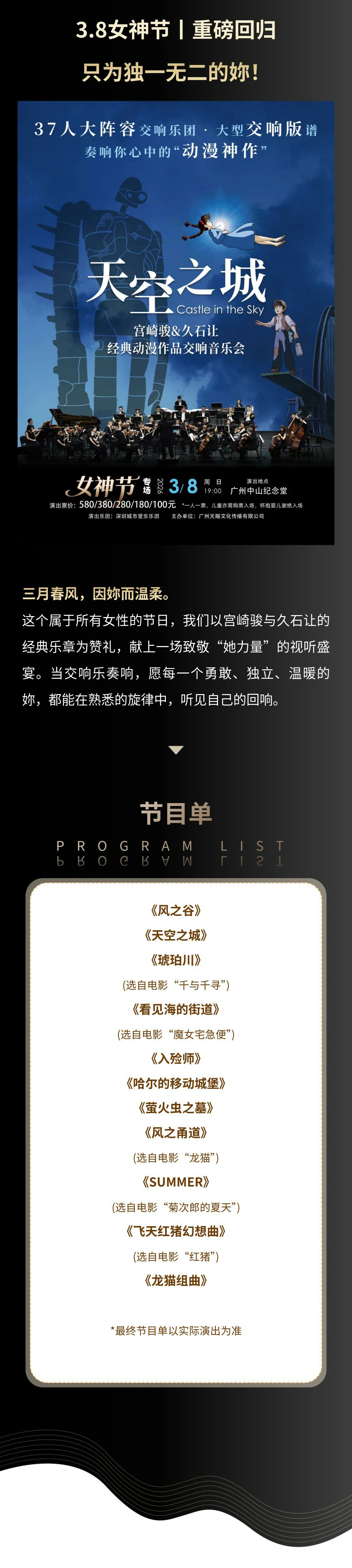 演出名称:【广州】37人交响乐团《天空之城》宫崎骏&久石让经典动漫作品交响音乐会【网上订票】演出时间:2026.06.18 周四 20:00