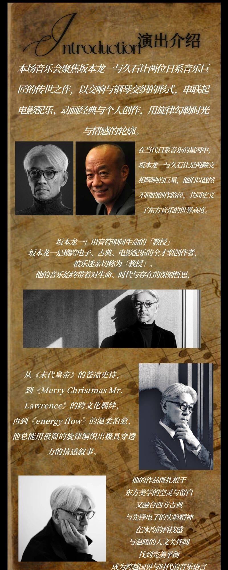 演出名称:【广州】《致敬坂本龙一&久石让 音乐会》【网上订票】演出时间:2026.04.26 周日 19:30