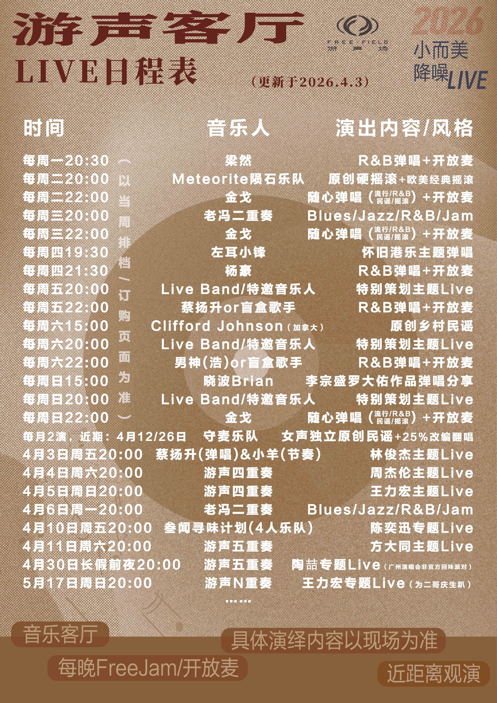 演出名称:【广州】游声降噪客厅,小而美音乐分享会|市中心老CBD,近淘金地铁站【网上订票】演出时间:2026.04.05-05.17