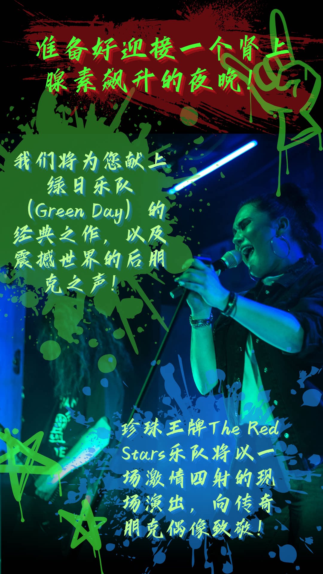 准备好迎接一个肾上腺素飙升的夜晚! 我们将为您献上绿日乐队(Green Day)的经典之作,以及震撼世界的后朋克之声! 珍珠王牌The Red Stars乐队将以一场激情四射的现场演出,向传奇朋克偶像致敬!