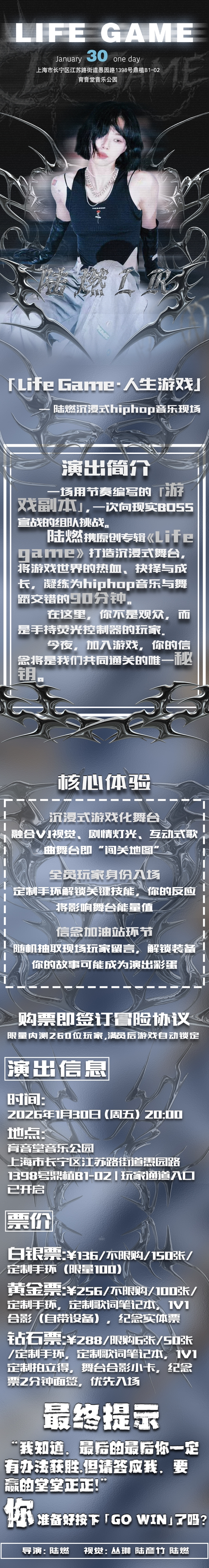 演出名称:【上海】「Life Game · 人生游戏」—— 陆燃沉浸式hiphop音乐现场【网上订票】演出时间:2026.01.30 周五 20:00