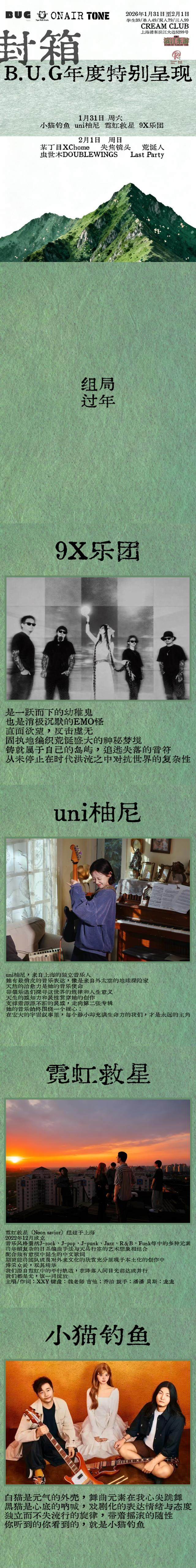 演出名称:【上海】【滨江乐游】第二十期 “封箱” B.U.G年度特别呈现 Day 1【网上订票】演出时间:2026.01.31 周六 19:45