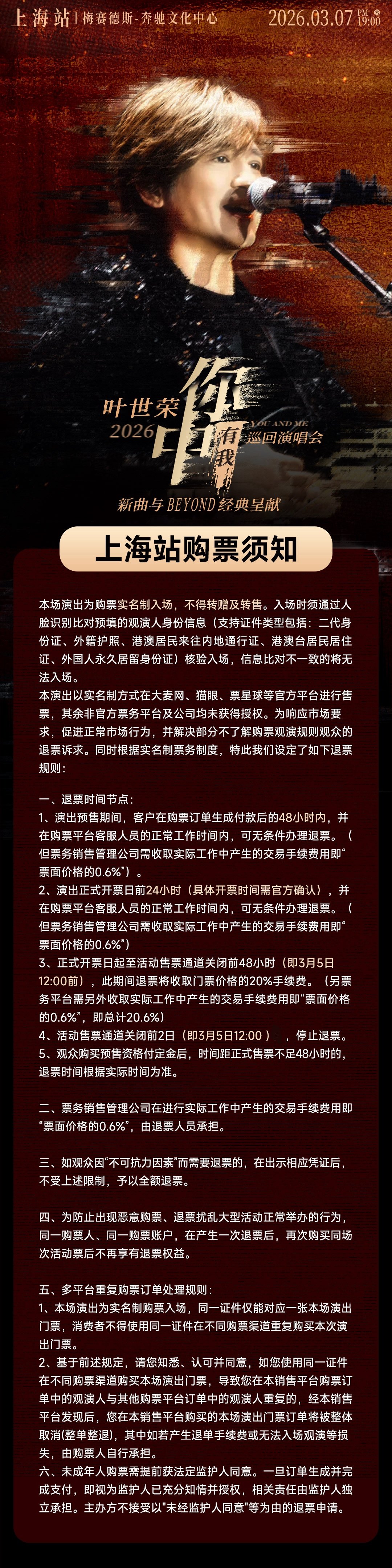 演出名称:【上海】2026叶世荣「你中有我」巡回演唱会·上海站【网上订票】演出时间:2026.03.07 周六 19:00