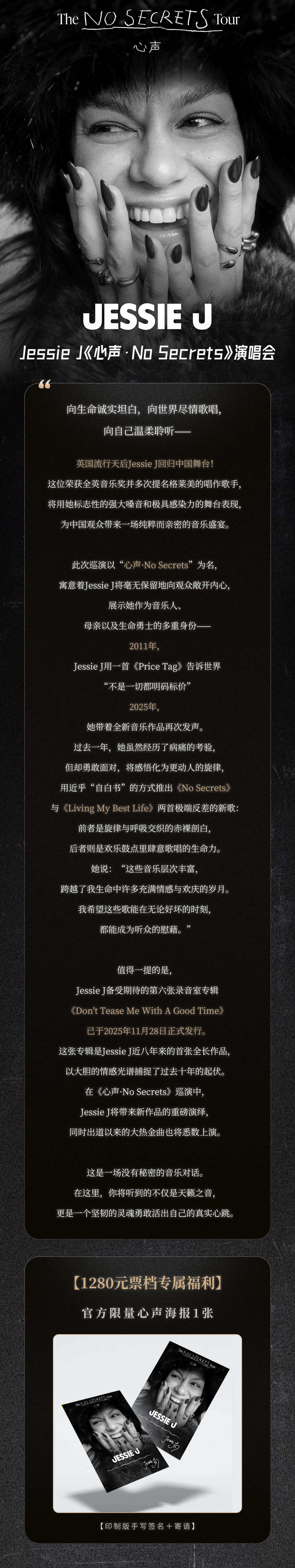 演出名称:【上海】Jessie J “心声·No Secrets” Tour 演唱会-上海站【网上订票】演出时间:2026.03.22 周日 19:00