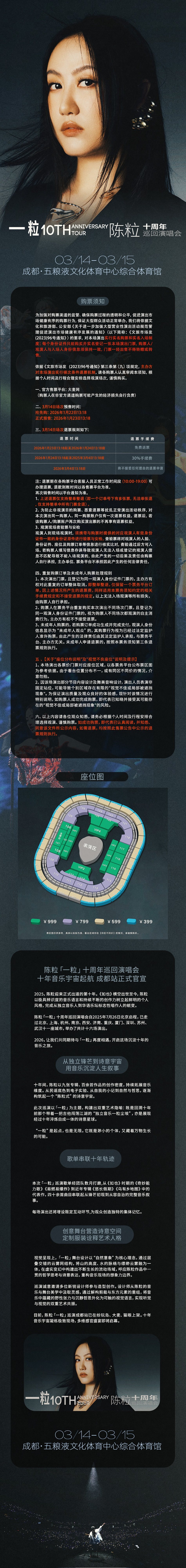 演出名称:【成都】2026陈粒「一粒」十周年巡回演唱会-成都站【网上订票】演出时间:2026.03.14-03.15