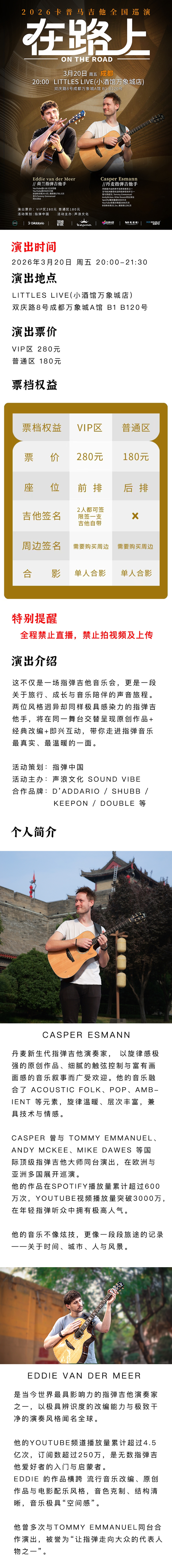 演出名称:【成都】卡普马 2026《在路上》Casper &Eddie 指弹吉他音乐会 成都站【网上订票】演出时间:2026.03.20 周五 20:00