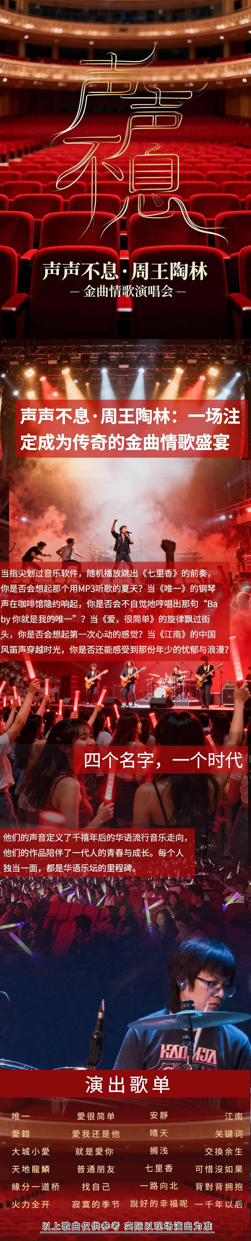 演出名称:【成都】声声不息·周王陶林金曲情歌演唱会-成都站【网上订票】演出时间:2026.04.18 周六 19:30