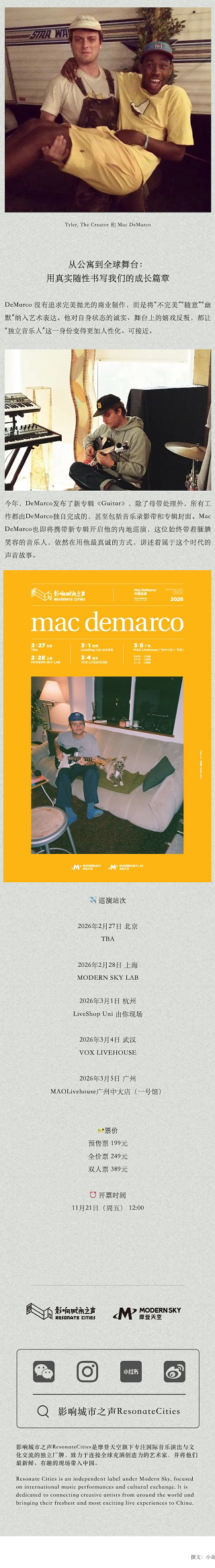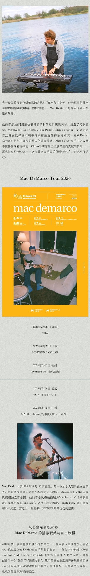 演出名称:【杭州】mac demarco tour 杭州站【网上订票】演出时间:2026.03.01 周日 20:00