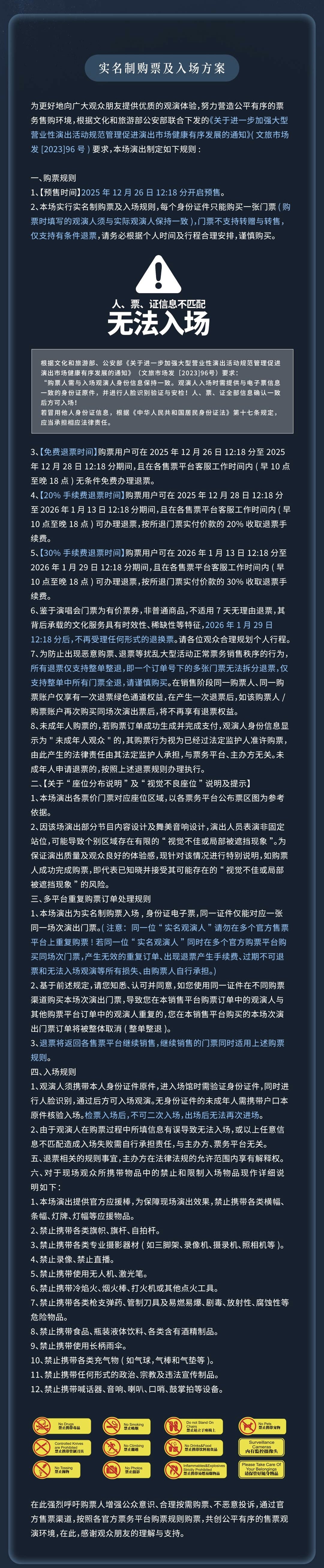 本项目于2026年1月22日19:00二次开票,本次售票延用2025年12月26日预售时的退票规则,购票用户可在 2026 年1月22日19:00至1月29日12:18期间,且在各售票平台客服工作时间内(早10点至晚18点),可办理退票,但需按实付订单金额的30%收取退票手续费。