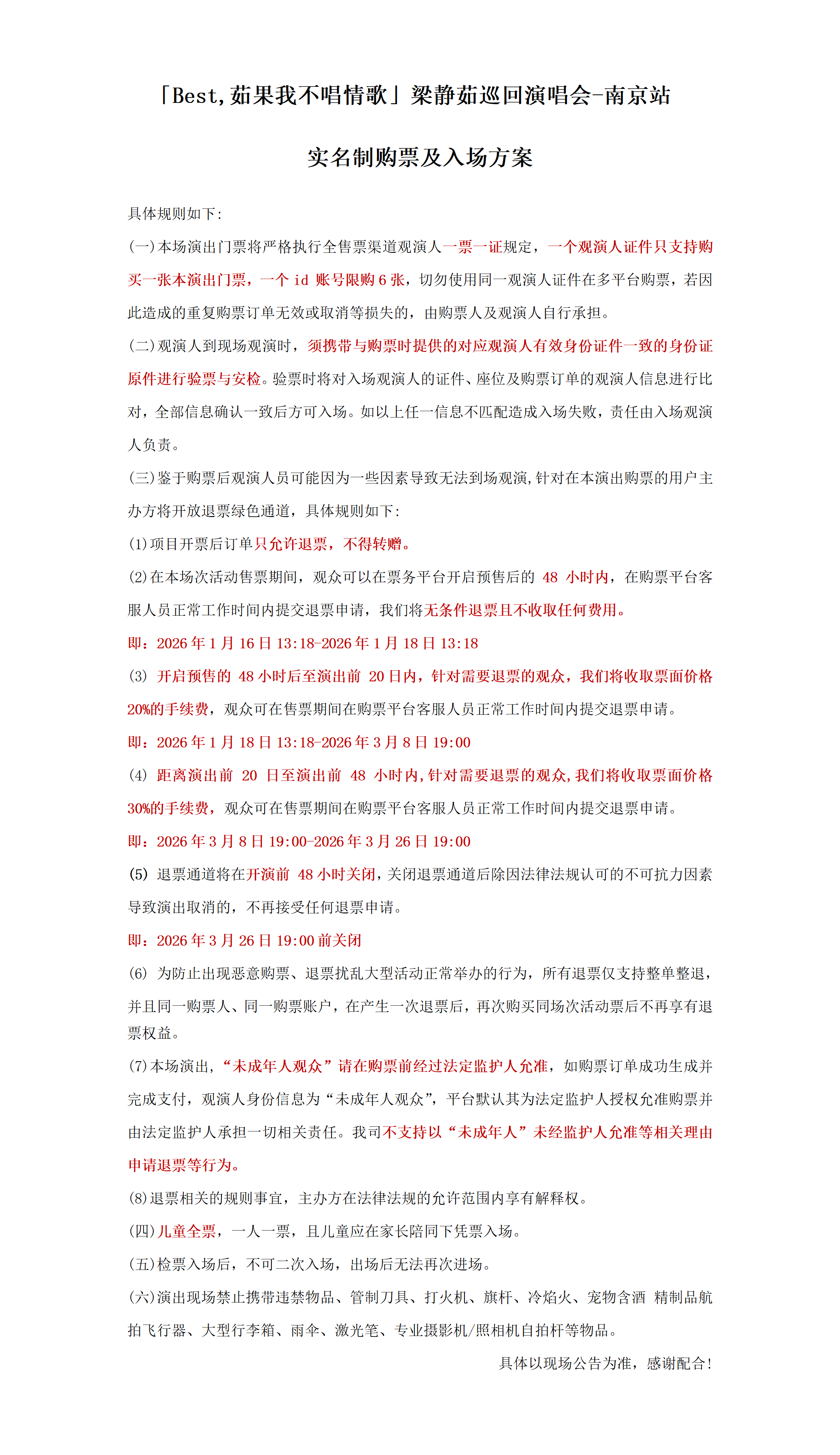 演出名称:【南京】「Best,茹果我不唱情歌」梁静茹巡回演唱会 南京站【网上订票】演出时间:2026.03.28 周六 19:00