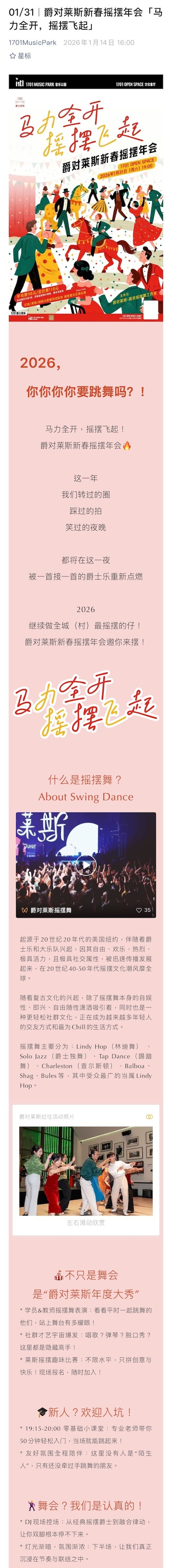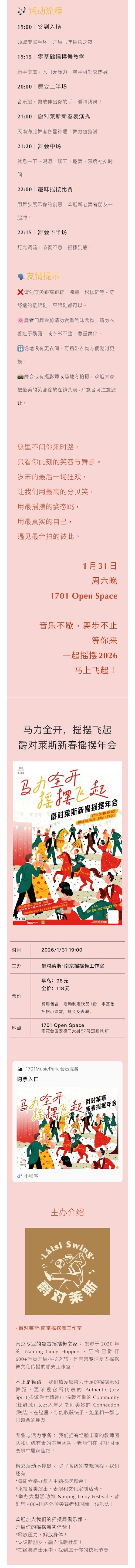 演出名称:【南京】爵对莱斯新春摇摆年会「马力全开,摇摆飞起」【网上订票】演出时间:2026.01.31 周六 19:00