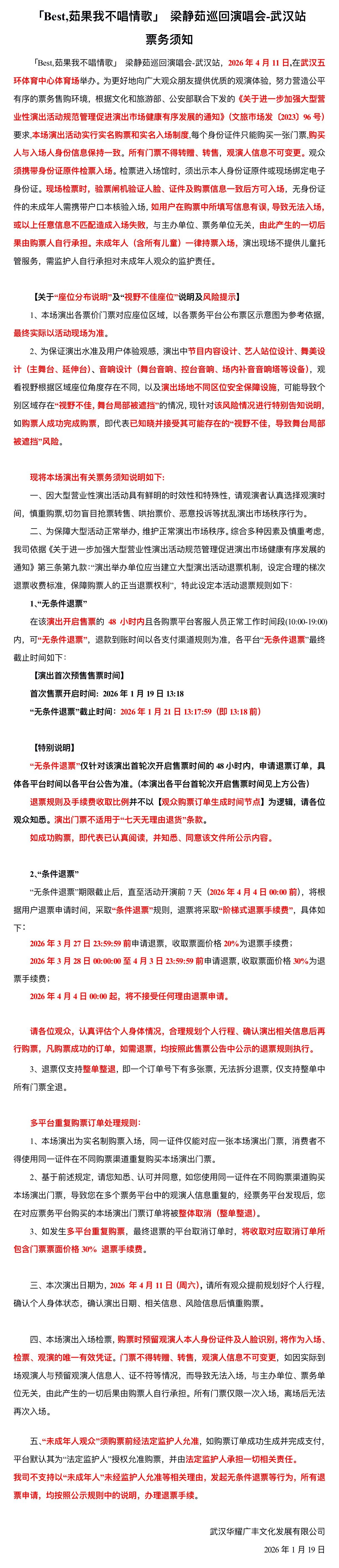 演出名称:【武汉】「Best,茹果我不唱情歌」 梁静茹巡回演唱会-武汉站【网上订票】演出时间:2026.04.11 周六 19:30
