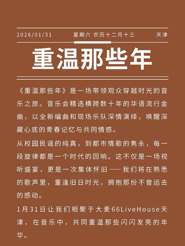 演出名称:【天津】《重温那些年》音乐会【网上订票】演出时间:2026.01.31 周六 20:00