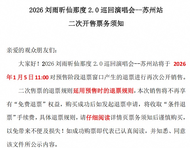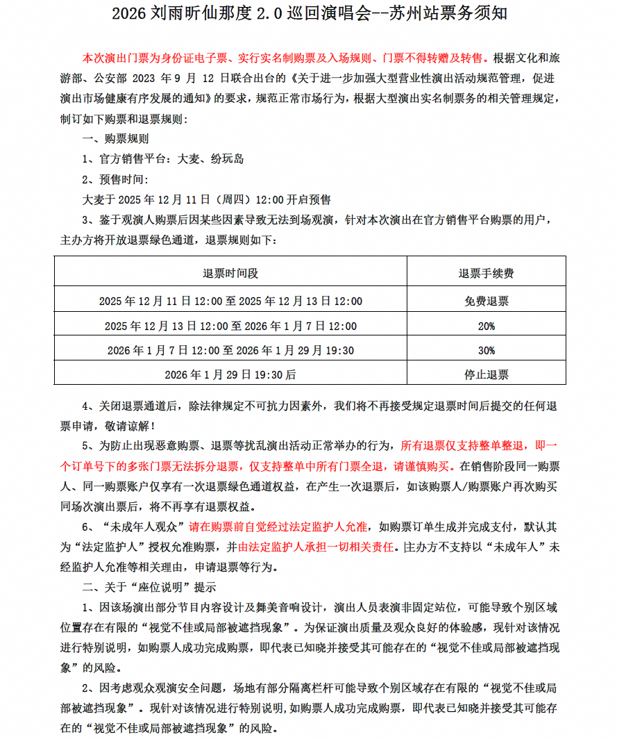 演出名称:【苏州】2026刘雨昕仙那度2.0巡回演唱会-苏州站【网上订票】演出时间:2026.01.31 周六 19:30