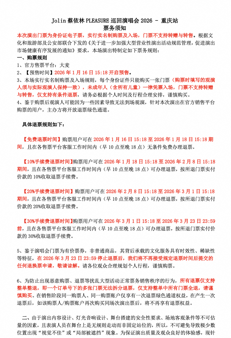 演出名称:【重庆】Jolin蔡依林PLEASURE巡回演唱会2026?-?重庆站【网上订票】演出时间:2026.03.28-03.29