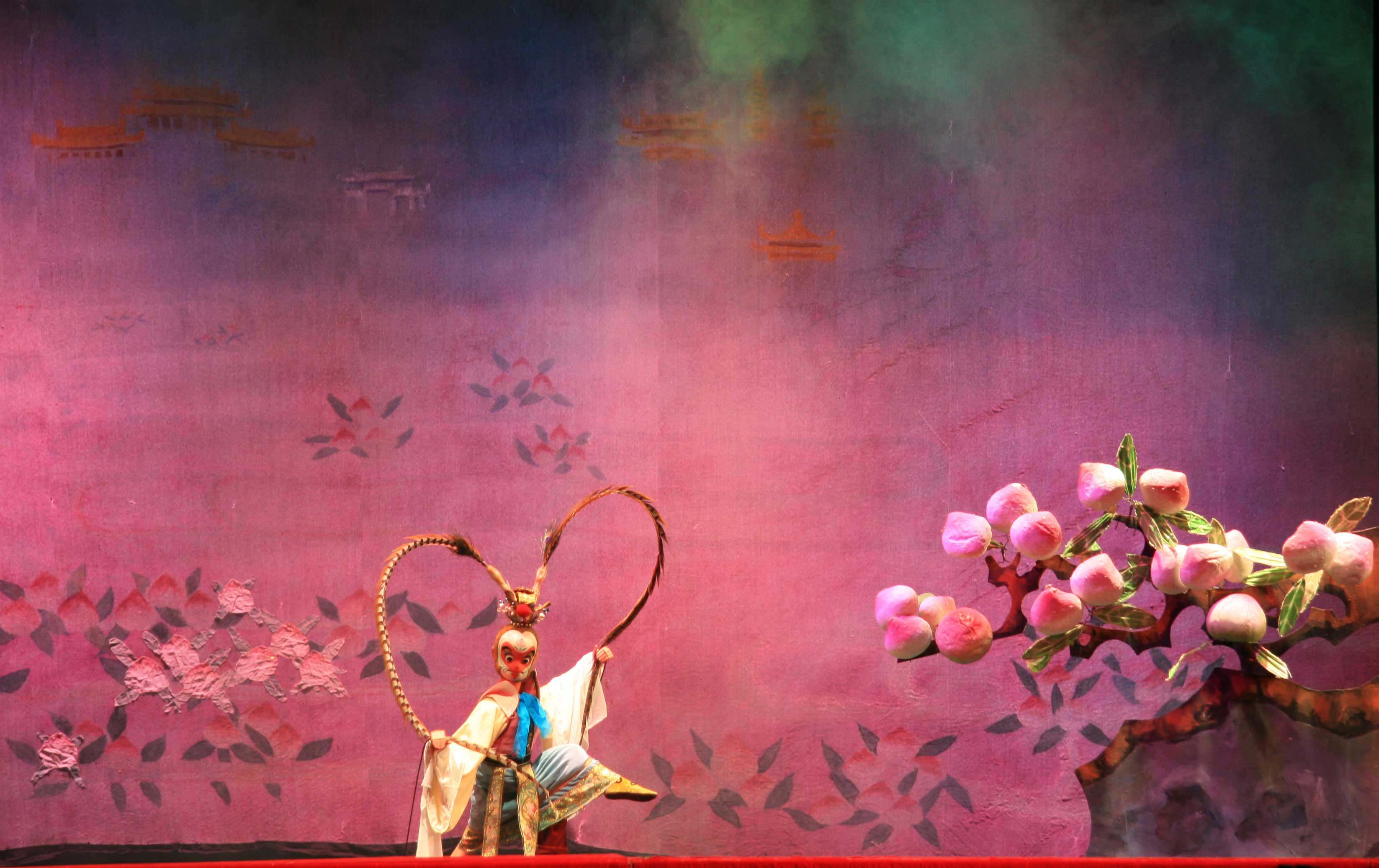 剧中主人公—孙悟空是人们理想中的克服困难勇往直前正义形象的化身。他带领群猴在花果山演兵习武,惊天动庭,被玉帝骗上天宫。孙悟空得知真相,不受羞辱,与天上诸神进行了智慧和力量的较量,引出了一个生动曲折、妙趣横生的故事,表现了孙悟空机智勇热爱自由的个性特征。