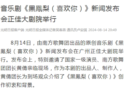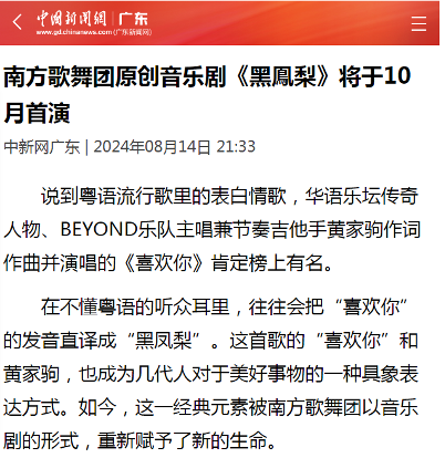 音乐剧《喜欢你》(粤语音:黑凤梨)自2024年10月首演以来,已演出30多场。2024年音乐剧《喜欢你》(粤语音:黑凤梨)应邀参加广州正佳大剧院国庆黄金周展演6场,同年,再受广州正佳大剧院邀请上演2场,同时,该剧作为2025年广州塔春节定制版广州塔剧场落成揭幕首演剧目连演21场,收获了海内外观众们的热烈掌声和一致好评,更获得了人民日报、南方日报、广州日报、网易新闻、广东广播电视台、广视网等国内各大媒体的关注和报道。